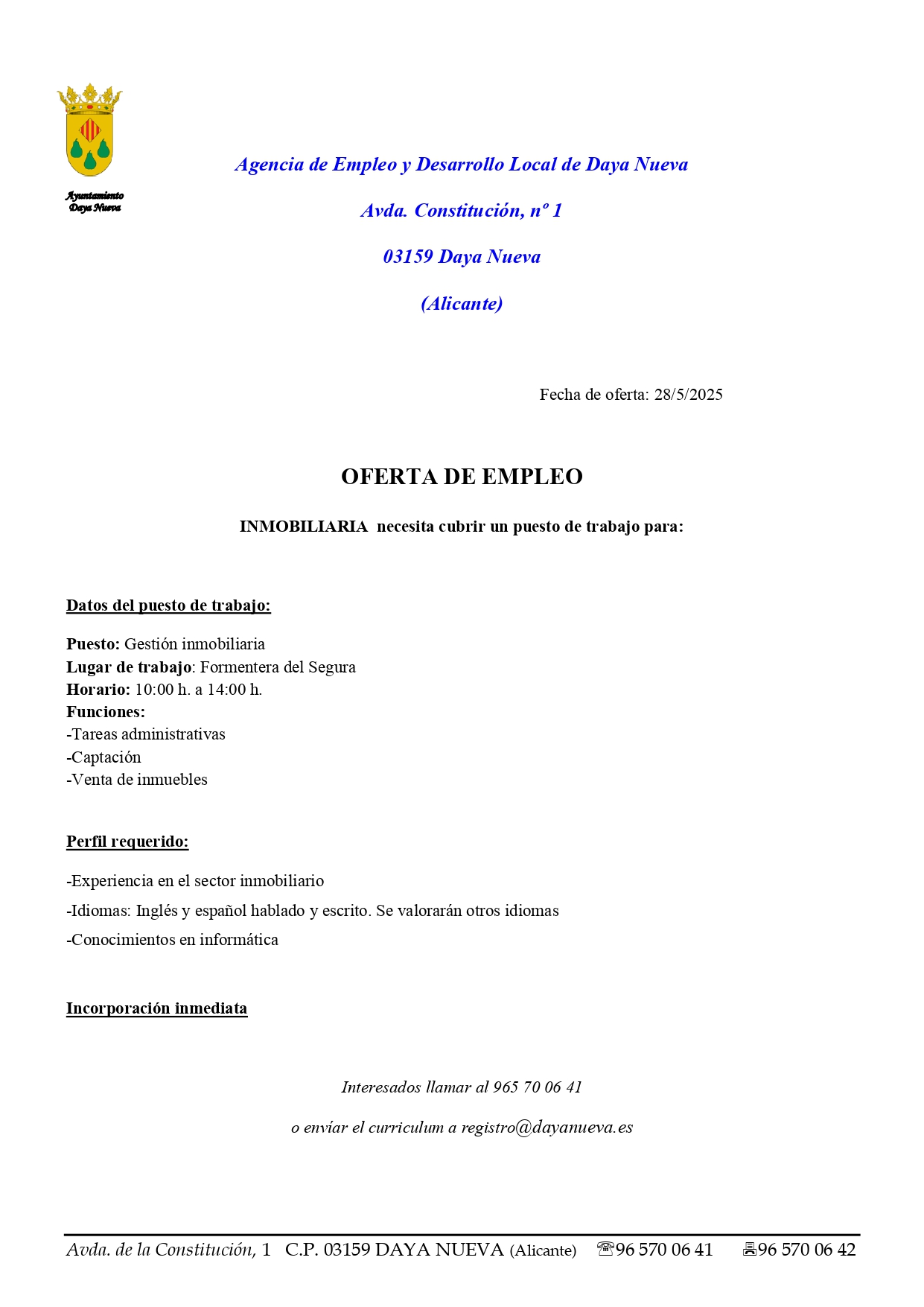 Inmobiliaria ubicada en Formentera del Segura busca personal para gestión inmobiliaria.